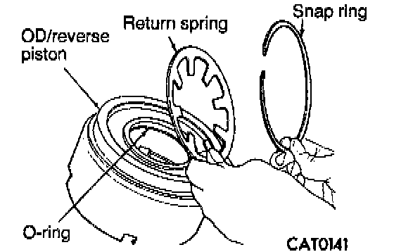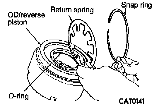 3. Install return spring and snap ring. Replace O-ring and lip seal of OD/reverse piston.