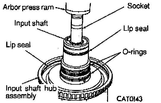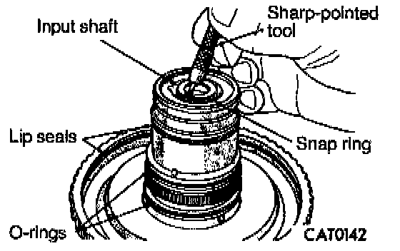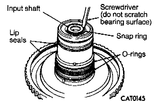 2. Install input shaft snap ring. Replace lip seals and O-rings. Do not scratch bearing surface.