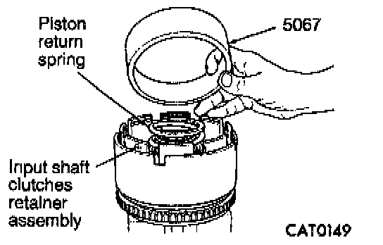 9. Install piston return spring. Install Seal Installer 5067. Coat Installer inner surface lightly with petroleum jelly. Place Installer into Input clutch assembly with its large inside diameter facing up.
