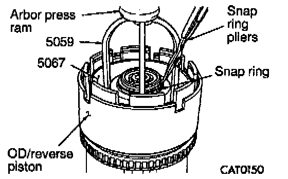 22. While pressure down overdrive/reverse pressure plate with Spring Compressor 5059 and arbor press ram, install flat snap ring.