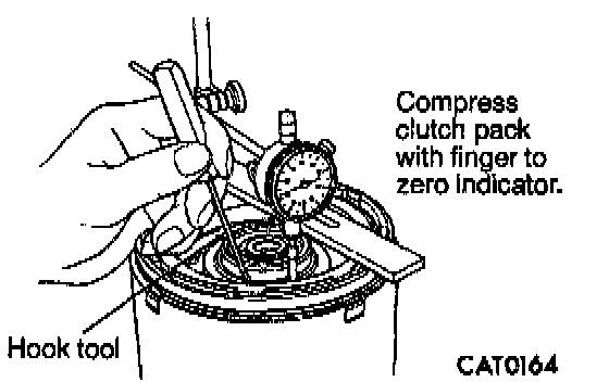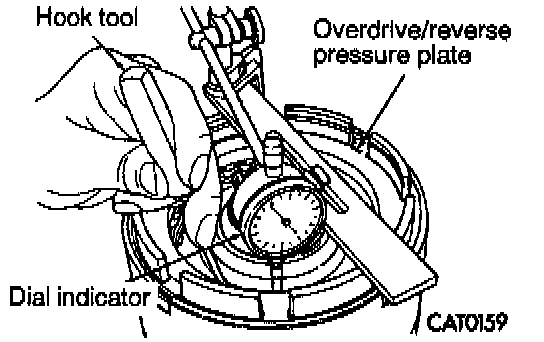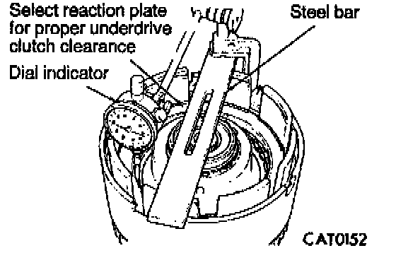 18. Use hook tool to raise top clutch disc. Read dial indicator. Underdrive clutch pack clearance must be 0.91 to 1.47 mm (0.0358 to 0.0579 inch). Select the Drover reaction plate to achieve specifications: