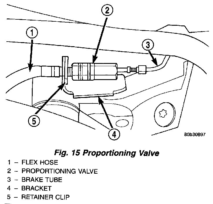 4. Remove the proportioning valve from the rear flex hose which is held stationary by a bracket mounted on the back side of the crossmember.