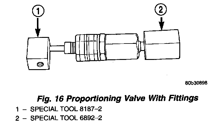 6. Correctly install Pressure Test Fittings, Special Tool 6892-2 into the inlet port, and Special Tool 8187-2 into the outlet port, of the proportioning valve.
