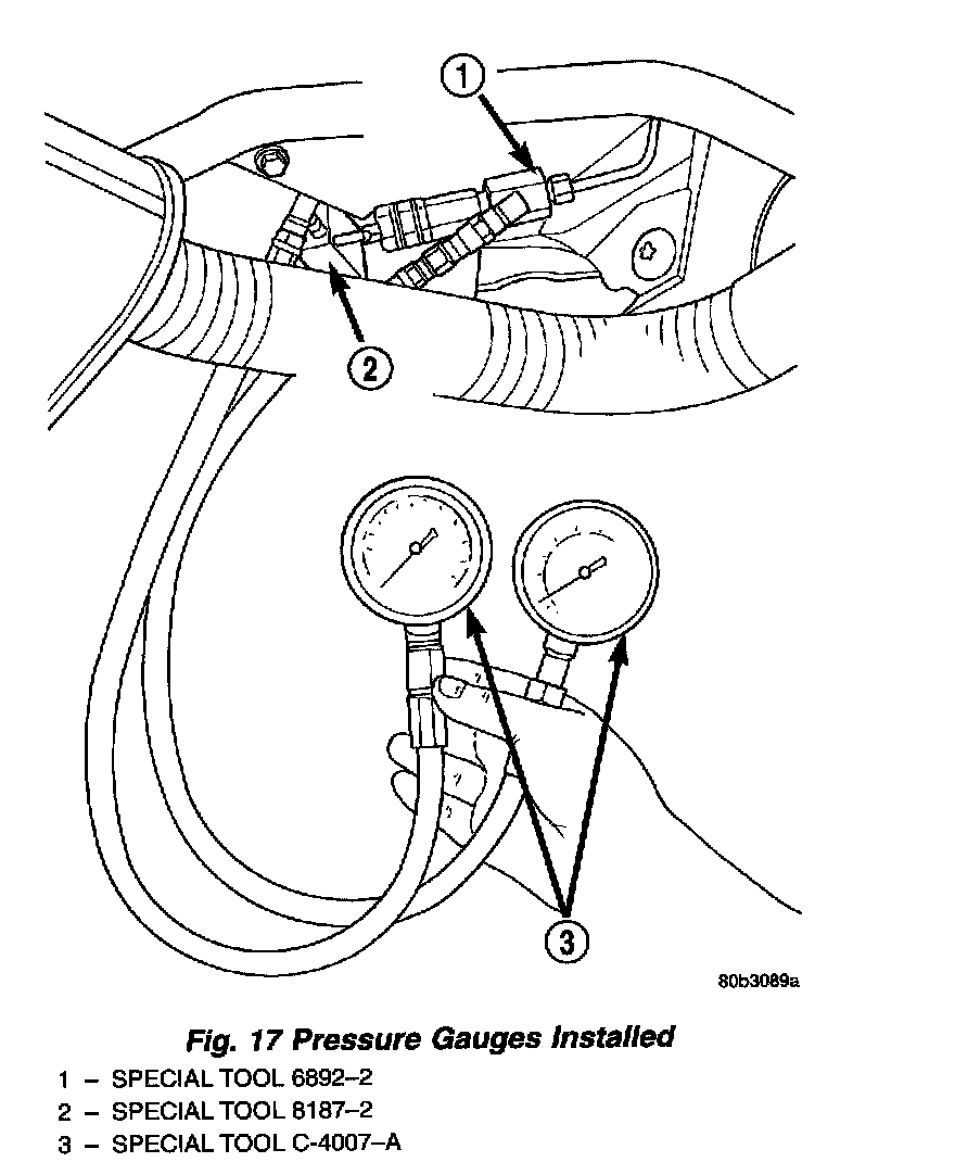 8. Install a Pressure Gauge, Special Tool C-4007-A into each pressure test fitting. Bleed any air out of the system. This includes bleeding the air from the hose between the pressure test fitting and pressure gauge, which is done at the pressure gauge.