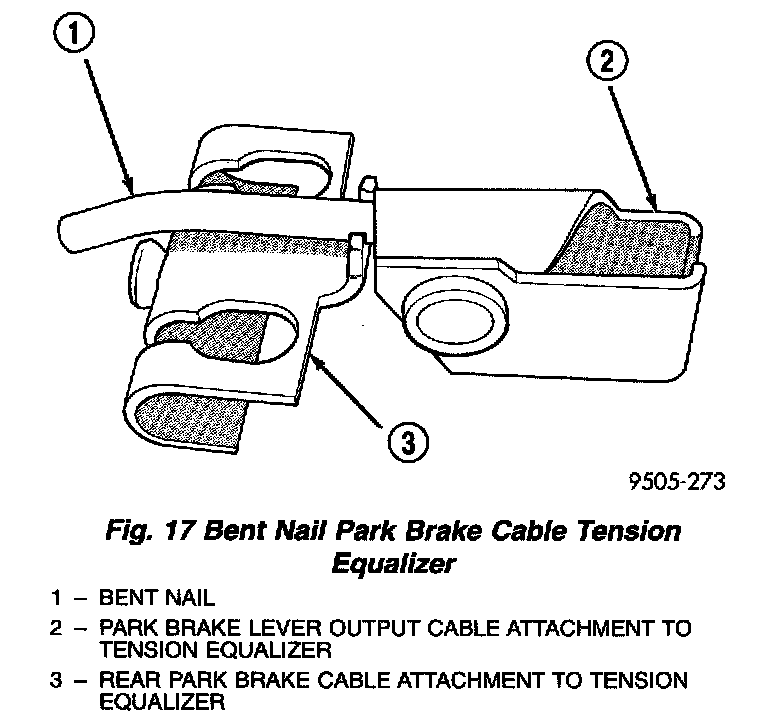 This vehicle uses a bent nail type park brake cable tension equalizer. The bent nail tension equalizer is to be used only one time to set the park brake cable tension. If the park brake cables require adjustment during the life of the vehicle, a NEW tension equalizer MUST be installed before doing the park cable adjustment procedure.