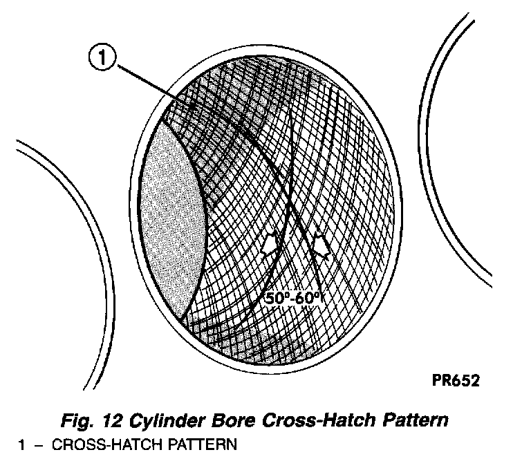 3. Honing should be done by moving the hone up and down fast enough to get a cross-hatch pattern. When hone marks intersect at 50-60 degrees, the cross hatch angle is most satisfactory for proper seating of rings (Fig. 12).