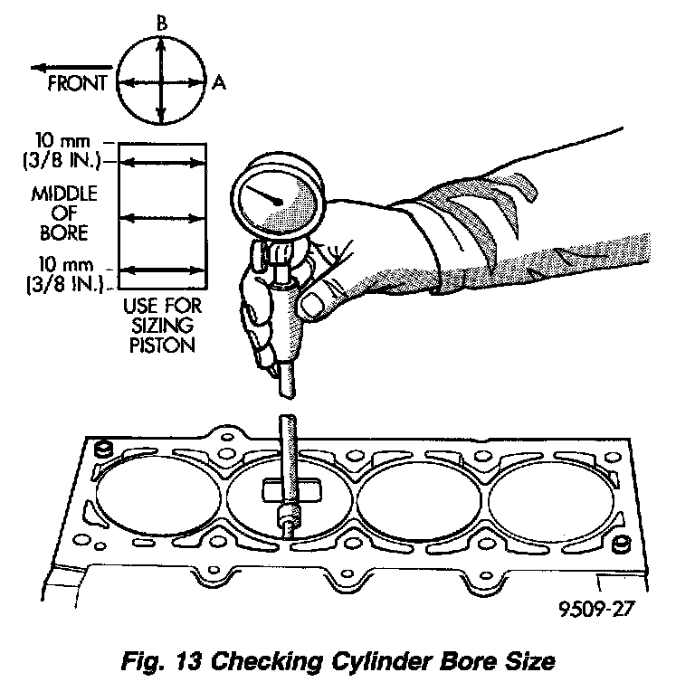 Piston and cylinder wall must be clean and dry. Piston diameter should be measured 90 degrees to piston pin about 14 mm (9/16 inch) from the bottom of the skirt as shown in (Fig. 14). Cylinder bores should be measured halfway down the cylinder bore and transverse to the engine crankshaft center line shown in (Fig. 14). Refer to for Engine Specifications. Correct piston to bore clearance must be established in order to assure quiet and economical operation.