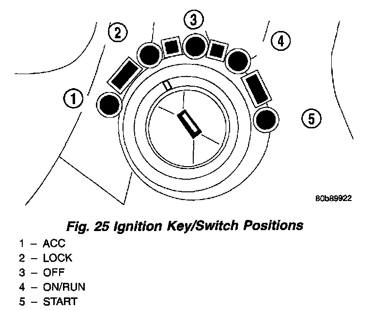The Brake Transmission Shifter/Ignition Interlock (BTSI) is engaged whenever the ignition switch is in the LOCK or ACCESSORY position (Fig. 25). An additional electrically activated feature will prevent shifting out of the PARK position unless the brake pedal is depressed at least one-half inch. A magnetic holding device integral to the interlock cable is energized when the ignition is in the ON/RUN position. When the key is in the ON/RUN position and the brake pedal is depressed, the shifter is unlocked and will move into any position. The interlock system also prevents the ignition switch from being turned to the LOCK or ACCESSORY position, unless the shifter is in the gated PARK position.