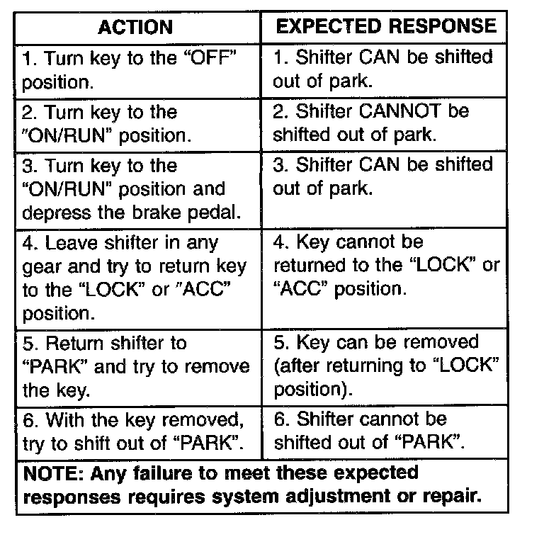 The chart describes the normal operation of the Brake Transmission Shift Interlock (BTSI) system. If the "expected response" differs from the vehicle's response, then system repair and/or adjustment is necessary.