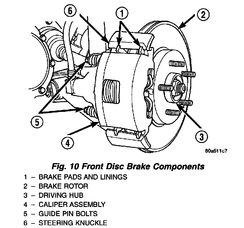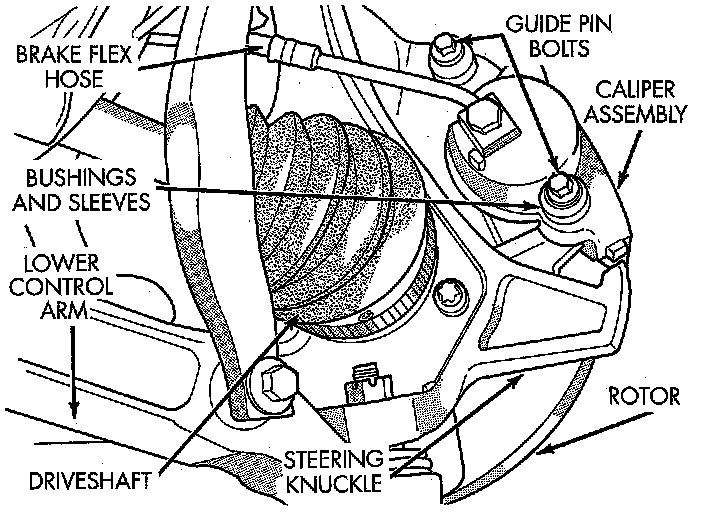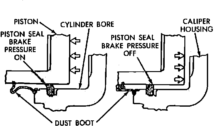 Two machined abutments on the steering knuckle position the caliper. The guide pin bolts, sleeves and bushings control the side to side movement of the caliper. The piston seal is designed to pull the piston back into the bore of the caliper when the brake pedal is released. This maintains the proper brake pad to rotor clearance.