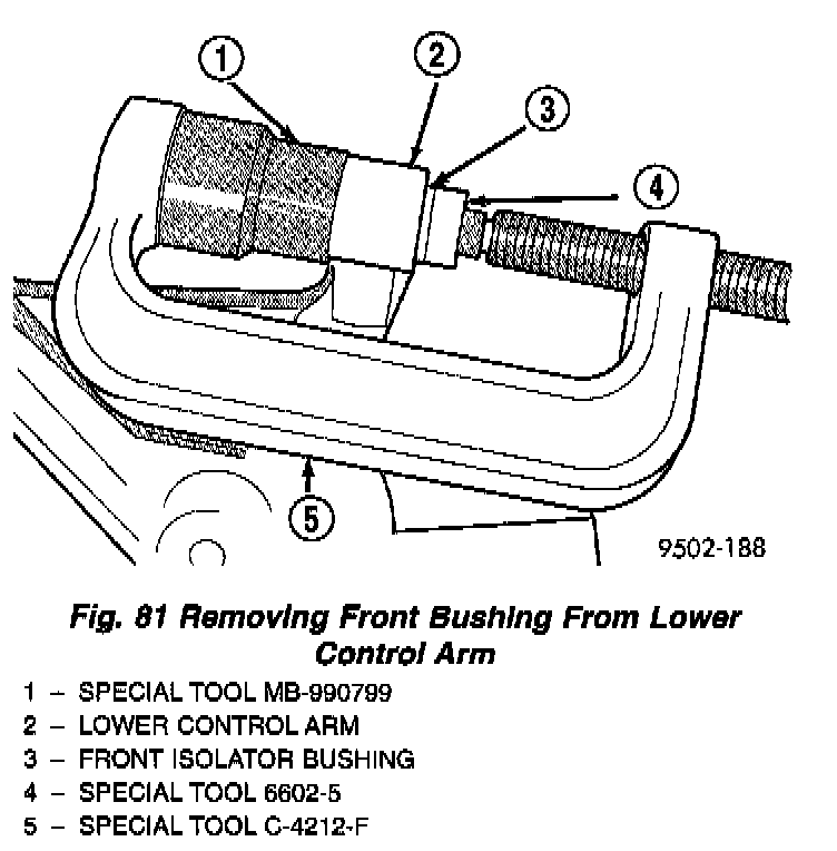 3. Install lower control arm on Special Tools assembled for removal of the front isolator bushing. Be sure Special Tool MB-990799 is square on lower control arm and Special Tool 6602-5 is positioned correctly on isolator bushing.