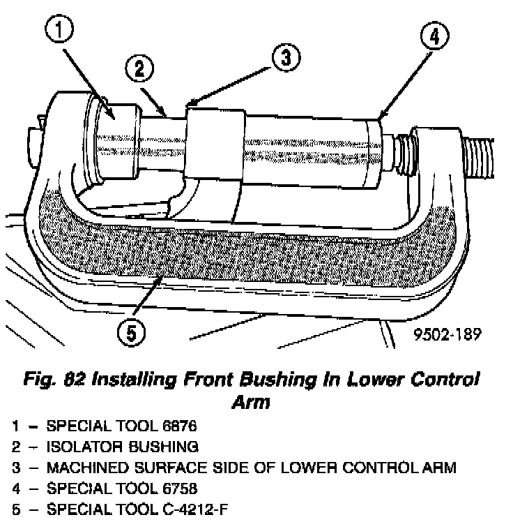 4. Tighten screw on Remover/Installer Special Tool C-4212-F pressing front bushing into lower control arm. Continue pressing front bushing into lower control arm until bushing is sitting flush on the machined surface of the lower control arm. This will correctly position front bushing in lower control arm.