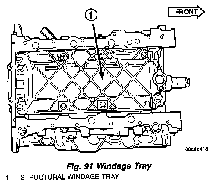 10. Install windage tray (Fig. 91). Lubricate bolts with engine oil and tighten to 27 Nm + 1/4 Turn (20 ft. lbs. + 1/4 turn).