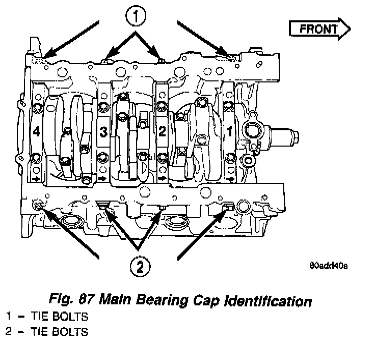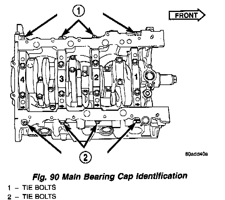 11. Install the main cap tie (horizontal) bolts and tighten to 28 Nm (250 in. lbs.) (Fig. 90).