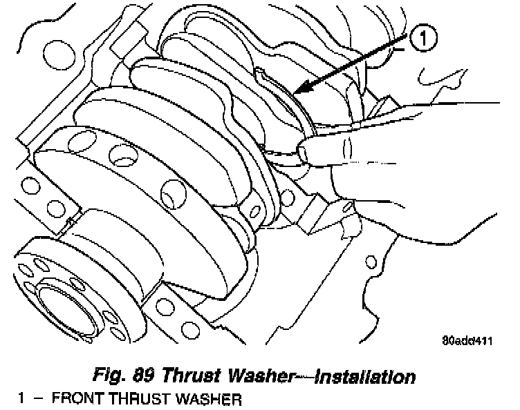 3. Push crankshaft forward. Lubricate and install the front thrust washer by rolling the thrust washer onto the machined shelf between the No. 3 upper main bulk head and crankshaft thrust surface (Fig. 89).