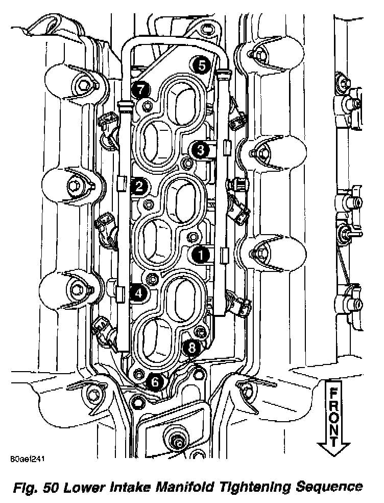 4. Install manifold attaching bolts and tighten in sequence shown in (Fig. 50) to 12 Nm (105 in. lbs.). Remove bolt used for aligning manifold.
