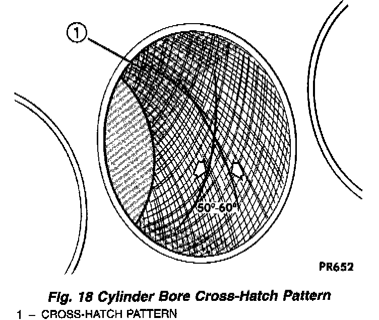 3. Honing should be done by moving the hone up and down fast enough to get a cross-hatch pattern. When hone marks intersect at 50-60°, the cross hatch angle is most satisfactory for proper seating of rinds (Fig. 18).