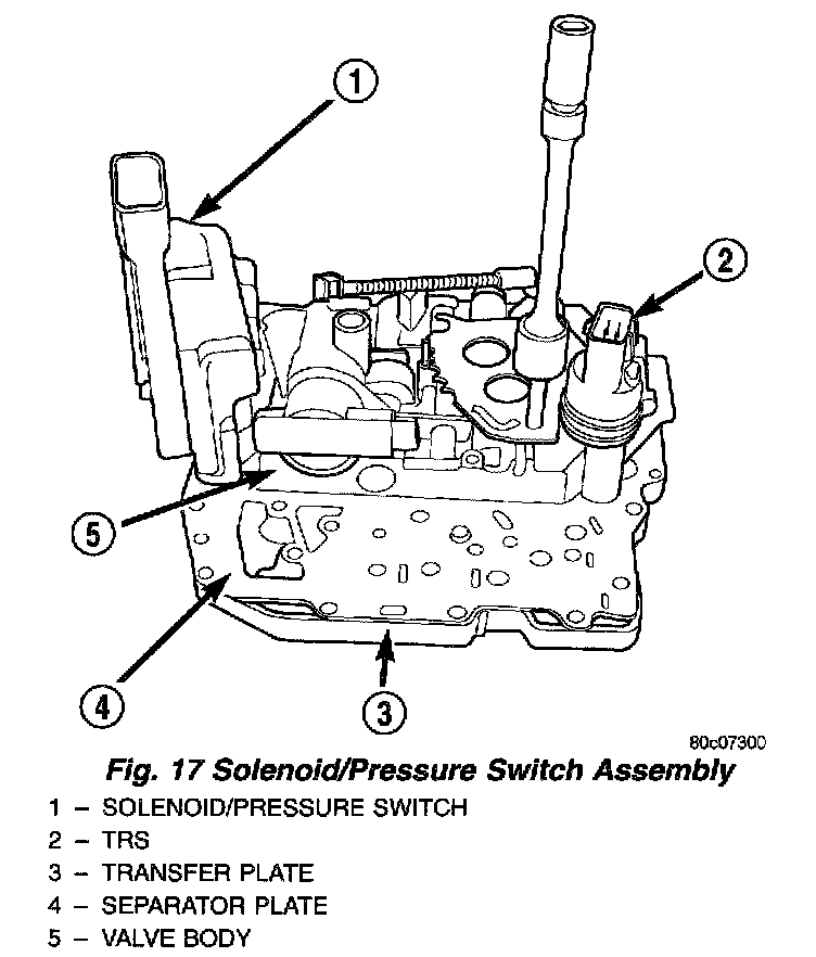 The Solenoid/Pressure Switch Assembly (Fig. 17) is inside the transaxle and mounted to the valve body assembly. The assembly consists of four solenoids that control hydraulic pressure to the L/R, 2/4, OD, and UD friction elements (transaxle clutches), and the torque converter clutch. The reverse clutch is controlled by line pressure from the manual valve in the valve body. The solenoids are contained within the Solenoid/Pressure Switch Assembly, and can only be serviced by replacing the assembly.