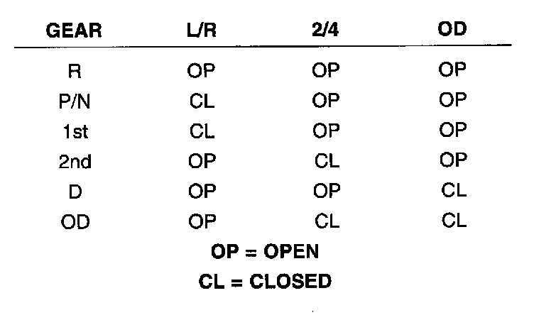 The TCM relies on three pressure switches to monitor fluid pressure in the L/R, 2/4, and OD hydraulic circuits. The primary purpose of these switches is to help the TCM detect when clutch circuit hydraulic failures occur. The range for the pressure switch closing and opening points is 11 - 23 psi. Typically the switch opening point will be approximately one psi lower than the closing point. For example, a switch may close at 18 psi and open at 17 psi. The switches are continuously monitored by the TCM for the correct states (open or closed) in each gear as shown in the following chart: