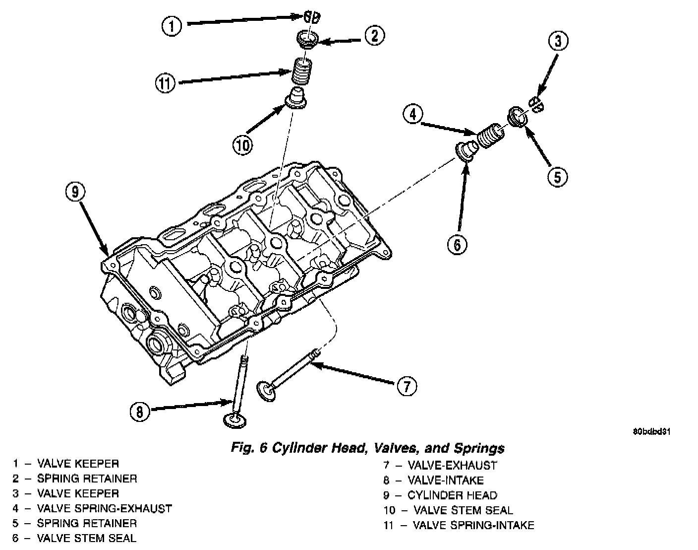 The valve springs are made from high strength, chrome-silicon steel (Fig. 6). The springs are common for intake and exhaust applications. The valve spring seat is integral with the valve stem seal, which incorporates a garter spring to maintain consistent lubrication control to the valve stem.