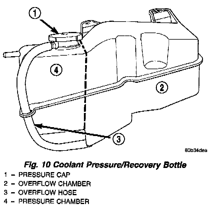 DESCRIPTIONThe coolant bottle consists of a pressure chamber and a overflow chamber that is mounted in the engine compartment. The overflow hose connects the pressure chamber to the overflow chamber.