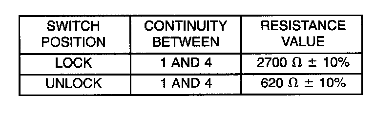 Remove the switch from its mounting location. Using an ohmmeter, refer to Door Lock Switch Continuity Test table to determine if continuity is correct in the LOCK and UNLOCK switch positions. If these results are not obtained, replace the switch.
