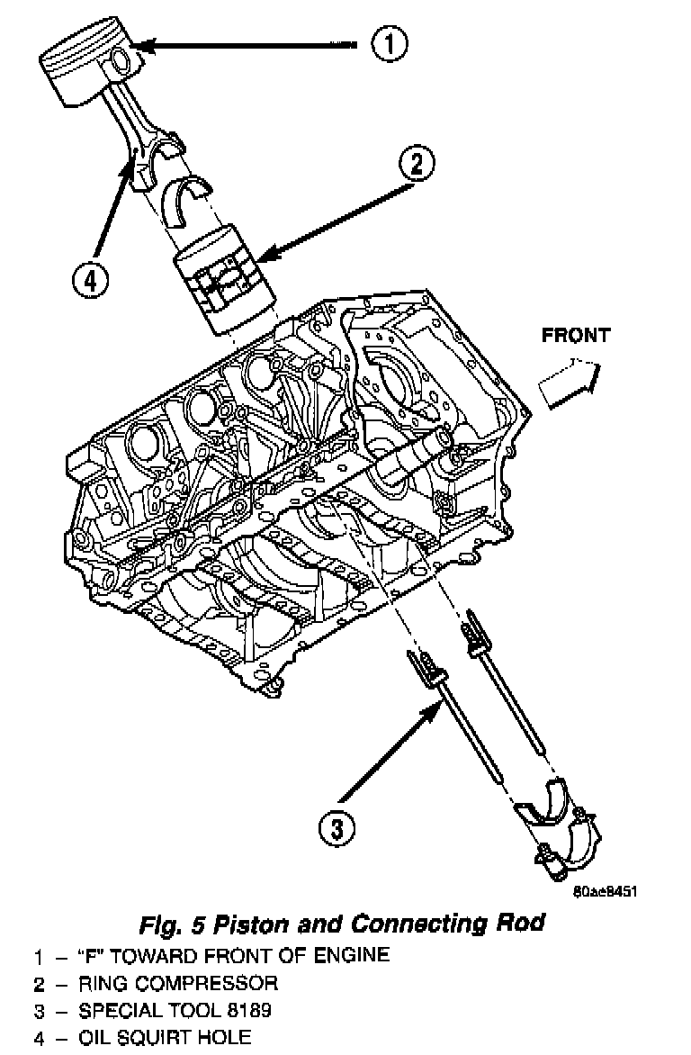 The pistons are made of a high strength aluminum alloy with an anodized top ring groove and crown. Piston skirts are coated with a solid lubricant for scuff resistance. The connecting rods are made of powdered metal with a "fractured cap" design. The connecting rod attaches to the piston with a full floating pin retained by lock rings. The piston and connecting rod are serviced as an assembly (Fig. 5).