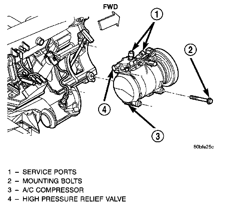 The A/C compressor may be unbolted and repositioned without discharging the refrigerant system. Discharging is not necessary if removing the compressor clutch/coil assembly, engine, cylinder head, or alternator.WARNING: REFRIGERANT PRESSURES REMAIN HIGH EVEN THOUGH THE ENGINE MAY BE TURNED OFF. DO NOT TWIST OR KINK THE REFRIGERANT LINES WHEN REMOVING A FULLY CHARGED COMPRESSOR. SAFETY GLASSES MUST BE WORN.