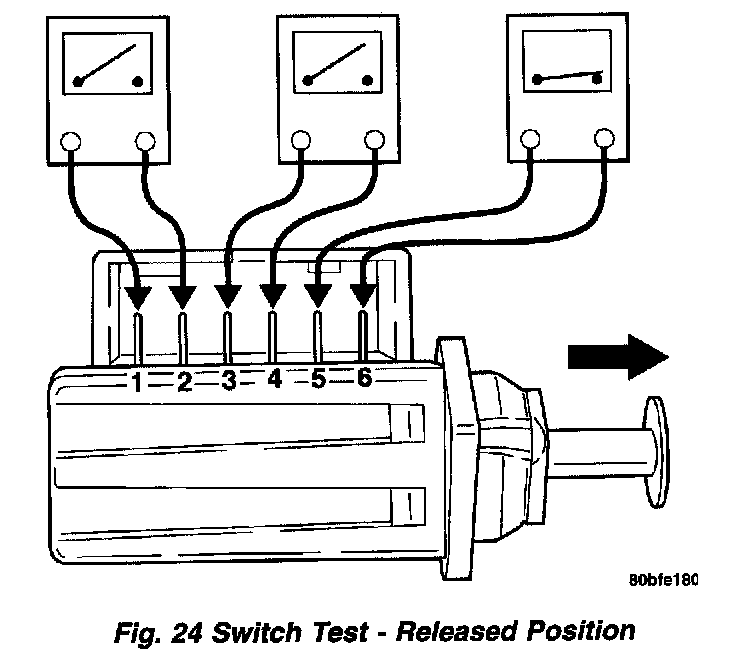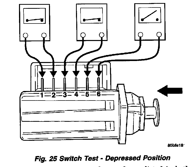 4. With the switch in the depressed position (plunger pushed in), use an ohmmeter to test each of the three internal switches as shown. You should achieve the results as listed in the figure.
