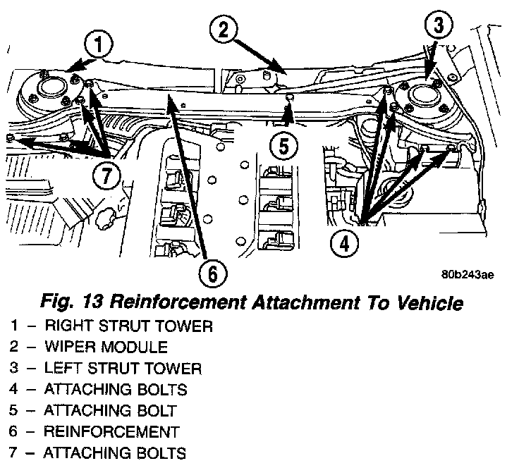 7. Remove the 8 bolts, attaching the reinforcement to the strut towers and the 1 bolt attaching the wiper module to the reinforcement. Remove the reinforcement from the vehicle.