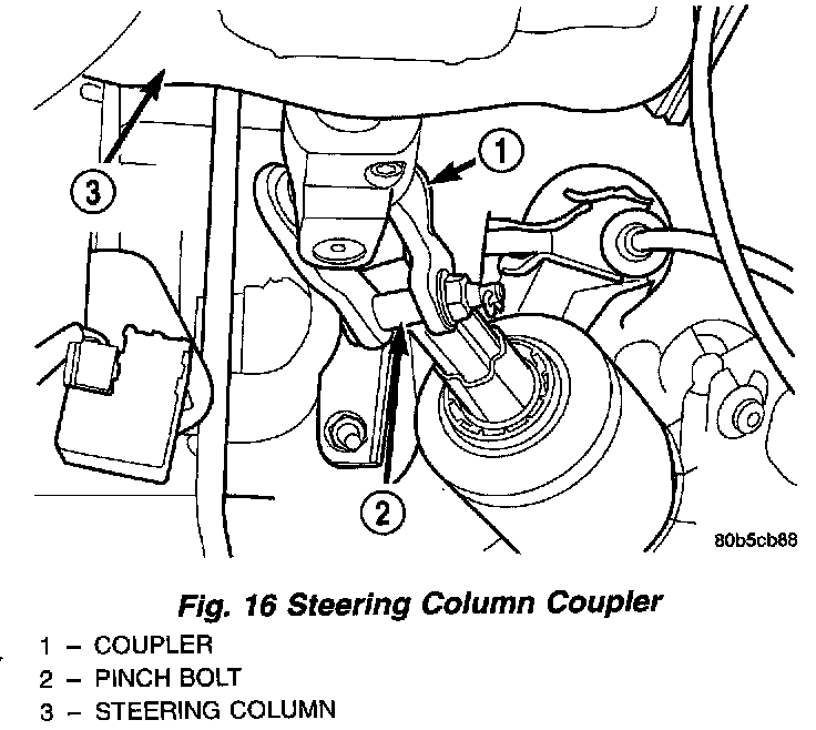 CAUTION: Before removing the steering column coupler from the intermediated steering shaft be sure the steering wheel is locked from rotating. If the steering wheel is allowed to rotate freely after it is disconnected from the intermediated shaft, the clockspring will be damaged and will need to be replaced.