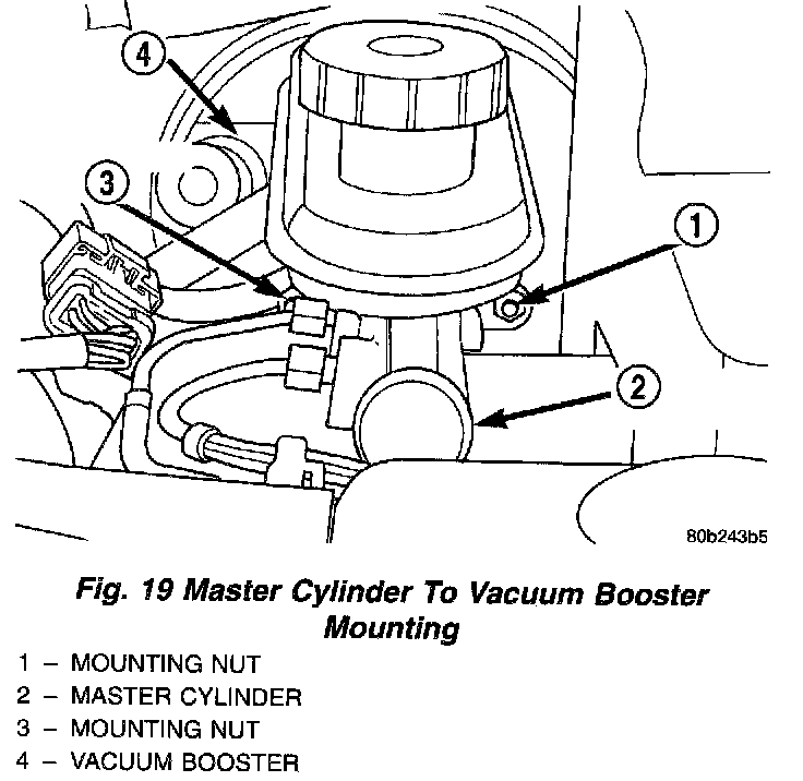 14. Install the master cylinder on the vacuum booster. Install the 2 nuts attaching the master cylinder to the vacuum booster. Tighten the master cylinder mounting nuts to a torque of 28 Nm (250 inch lbs.).