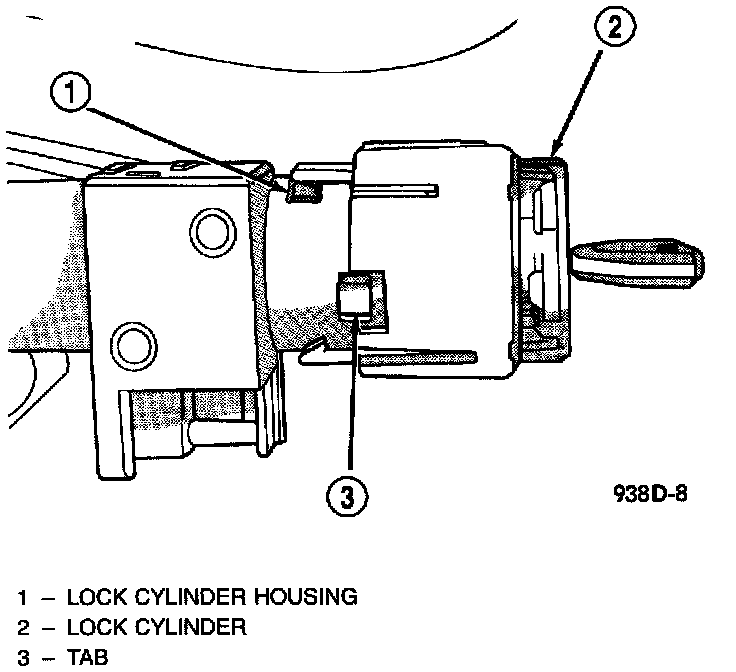 1. Install key in lock cylinder. Turn key to run position (retaining tab on lock cylinder can be depressed).