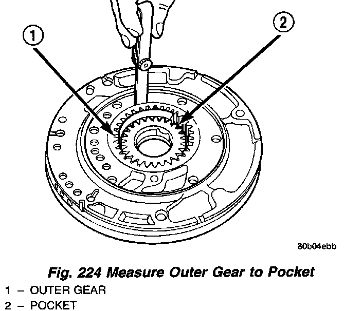5. Measure the clearance between the outer gear and the pump pocket (Fig. 224). Clearance should be 0.045 - 0.141mm (0.0018 - 0.0056 inch).