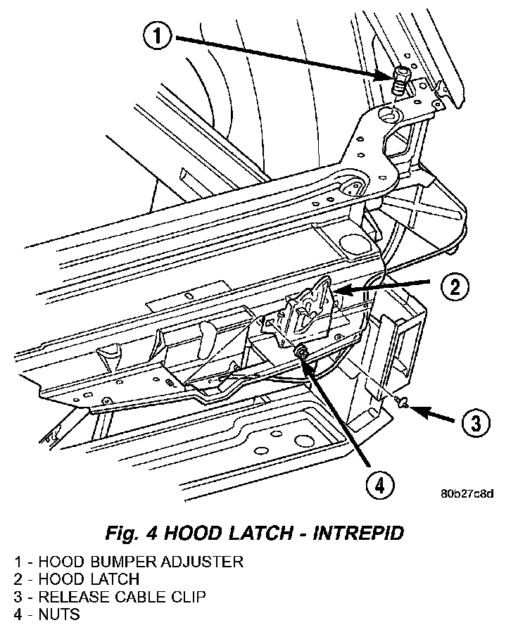 2. Remove nuts attaching hood latch to cross-member (Fig. 3) or (Fig. 4).