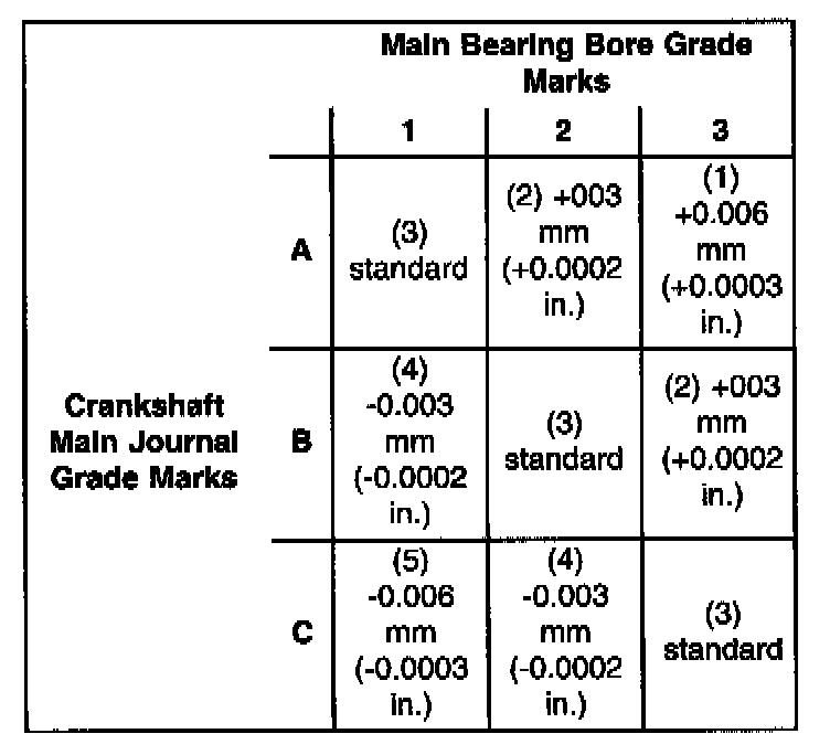 Use the Main Bearing Selection Chart to properly select the main bearings. For an example, if the main bore grade is 3 and the journal grade is B. the proper select fit bearing would be a 2 + 0.003 mm (+ 0.0002 inch).