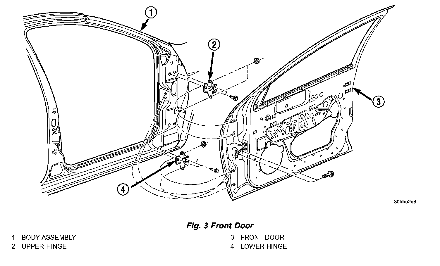 5. Remove bolts attaching upper hinge to door. (Fig. 3).