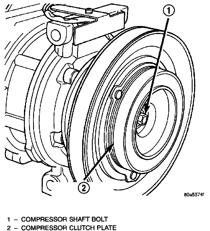 1. Remove the compressor shaft bolt. A band type oil filter removal tool can be placed around the clutch plate to aid in bolt removal.