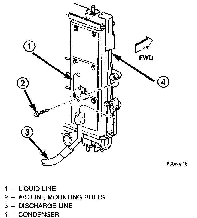 The condenser is located in front of the engine radiator. It has no serviceable parts. If damaged or leaking, the condenser assembly must be replaced.WARNING: THE REFRIGERANT MUST BE REMOVED FROM THE SYSTEM BEFORE REMOVING THE CONDENSER.