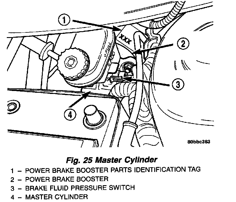 Master cylinder reservoirs are marked, FULL and MIN, indicating the allowable brake fluid level range in the master cylinder brake fluid reservoir.