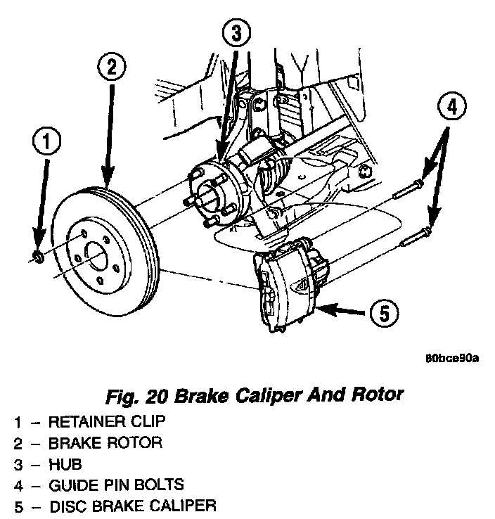 3. Remove the two guide pin bolts securing the front disc brake caliper to the steering knuckle.
