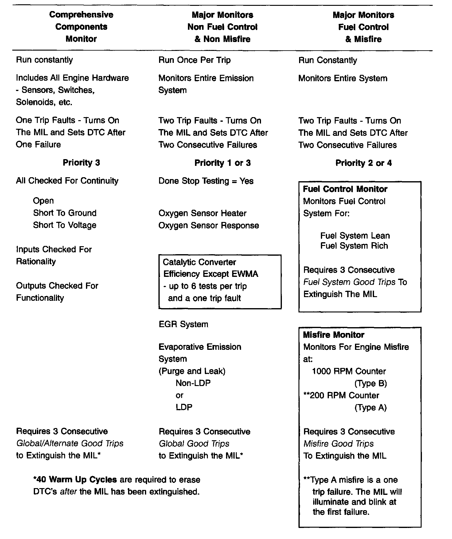 The table summarizes the various OBD II monitors operation.