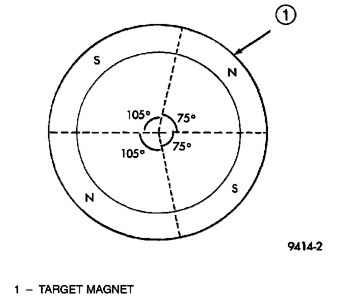 A target magnet attaches to the rear of the camshaft and indexes to the correct position. The target magnet has four different poles arranged in an asymmetrical pattern. As the target magnet rotates, the camshaft position sensor senses the change in polarity. The sensor output switch switches from high (5.0 volts) to low (0.5 volts) as the target magnet rotates. When the north pole of the target magnet passes under the sensor, the output switches high. The sensor output switches low when the south pole of the target magnet passes underneath.