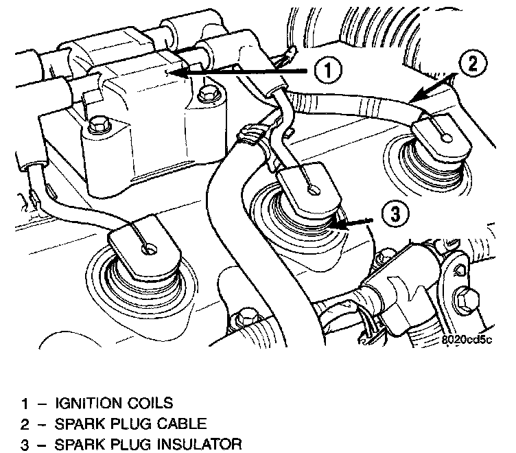 High tension leads route to each cylinder from the coil. The coil fires two spark plugs every power stroke. One plug is the cylinder under compression, the other cylinder fires on the exhaust stroke. Coil number one fires cylinders 1 and 4. Coil number two fires cylinders 2 and 3. The PCM determines which of the coils to charge and fire at the correct time.
