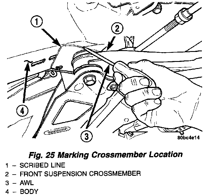 6. Using an awl, scribe a line marking the location of where the front suspension crossmember is mounted against the body of the vehicle.