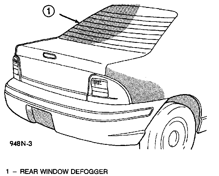 3. The rear window defogger operation can be checked by feeling the glass. A distinct difference in temperature between the grid lines and adjacent clear glass can be detected in three to four minutes of operation.