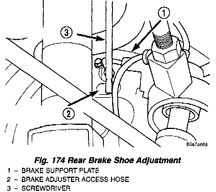NOTE: Normally, self adjusting drum brakes will not require manual brake shoe adjustment. Although in the event that the rear brake shoes are replaced it is advisable to make the initial adjustment manually to speed up the initial adjustment time.1. Raise vehicle using a frame contact type hoist or supported as required using jack stands. See Hoisting in Maintenance for the required hoisting or jacking procedure to be used for this vehicle.