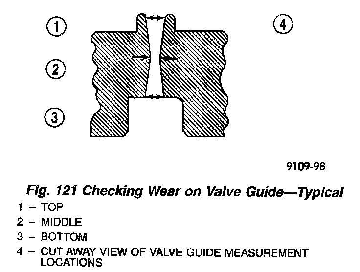 Using a small hole gauge and a micrometer, measure valve guides in 3 places top, middle and bottom (Fig. 121). Refer to Engine Specifications. Replace guides if they are not within specification.