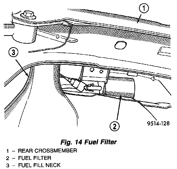 The fuel filter mounts to the frame above the rear of the fuel tank (Fig. 14). The inlet and outlet tubes are permanently attached to the filter.