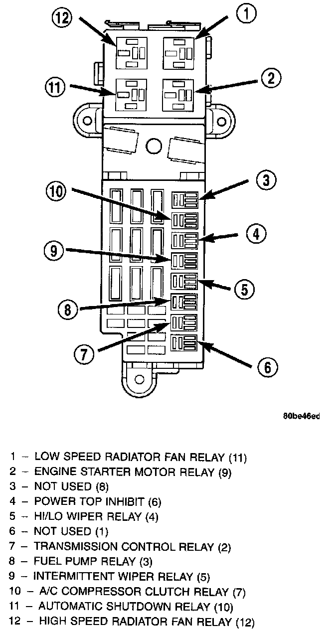The PDC housing is secured in the engine compartment on the left front corner with three screws to the transmission and engine control module bracket. A small red molded plastic protective cover on the top near the rear of the PDC is unsnapped to access the battery/generator cable input connection stud. All of the PDC outputs are through the integral engine compartment wire harness, which exits from the rear of the PDC housing.